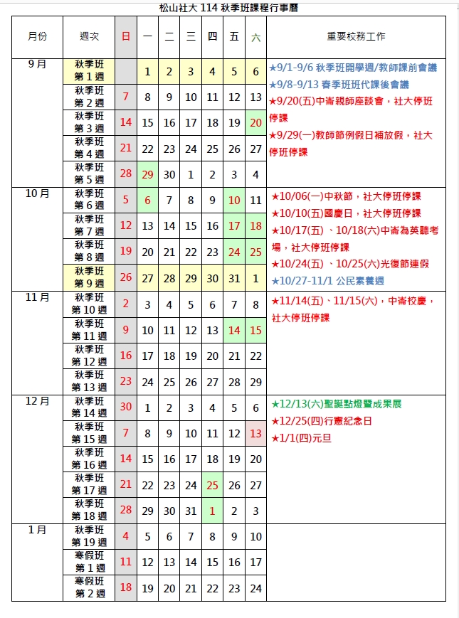 松山社大114秋季班課程行事曆
