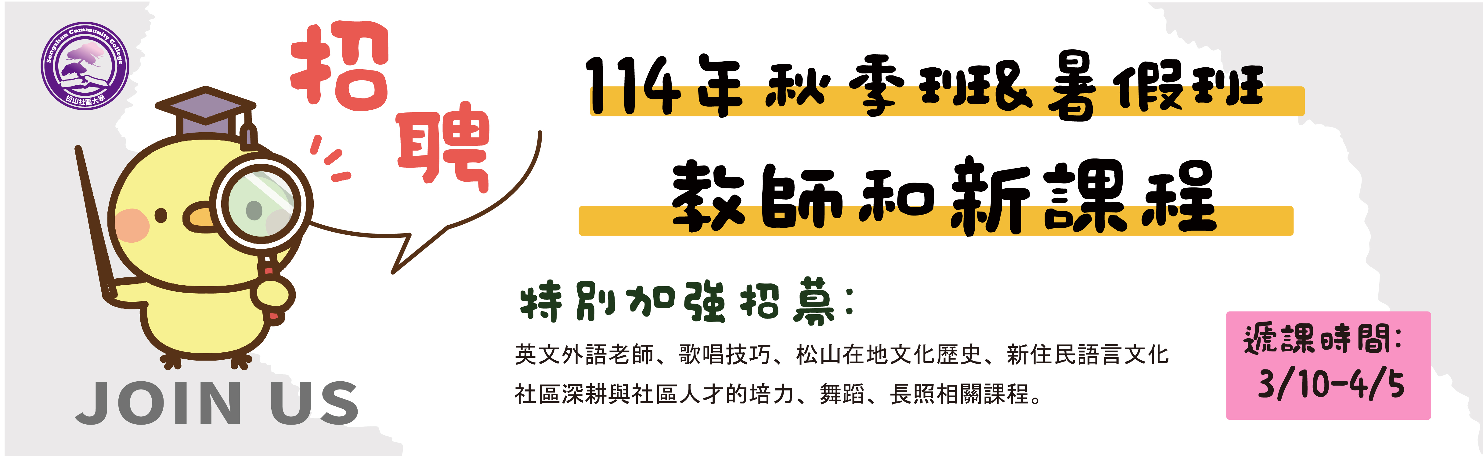 有理想、有意願在松山深耕的講師請加入我們。